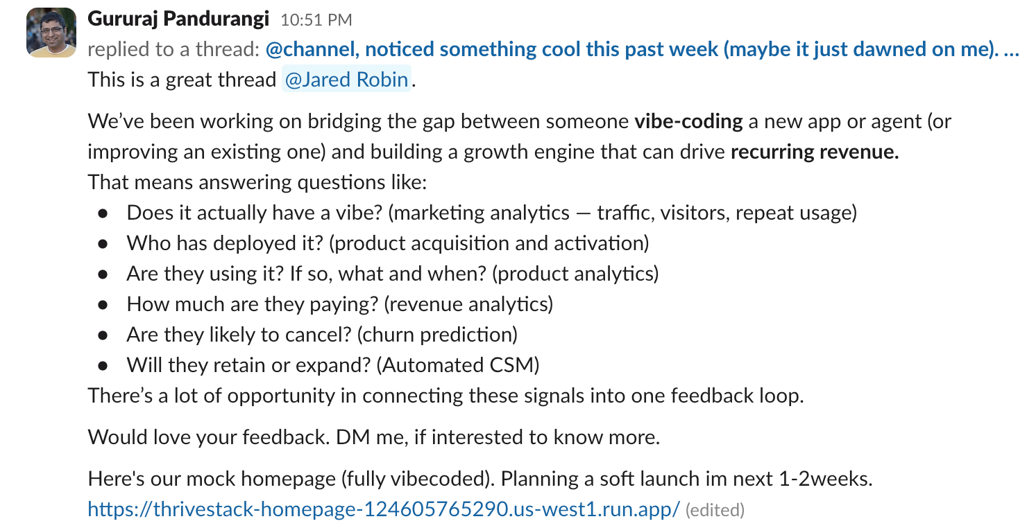 Gururaj Pandurangi is working on ThriveStack, bridging the gap between vibe-coding a new app and actually building a growth engine behind it. Traffic, activation, revenue analytics, churn prediction, automated CSM, one feedback loop. He built the mock homepage in 2 hours on Google AI Studio, 10-25 prompts.