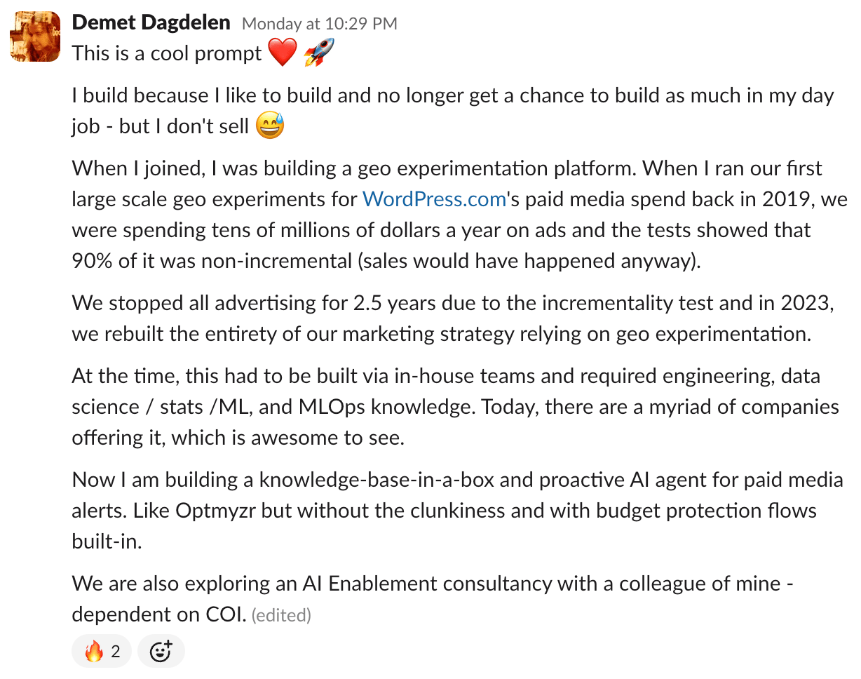 Demet Dagdelen came with receipts. Back in 2019 she ran geo experiments on WordPress.com's paid media spend tens of millions a year and found 90% of it was non-incremental. Sales would have happened anyway. They stopped all advertising for 2.5 years and rebuilt the entire marketing strategy around geo experimentation.