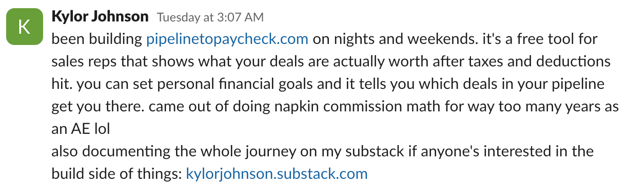 Kylor Johnson spent too many years as an AE doing commission math on napkins. So he built pipelinetopaycheck.com on nights and weekends — a free tool that shows reps what their deals are actually worth after taxes and deductions, and tells you which deals in your pipeline actually get you to your financial goals.