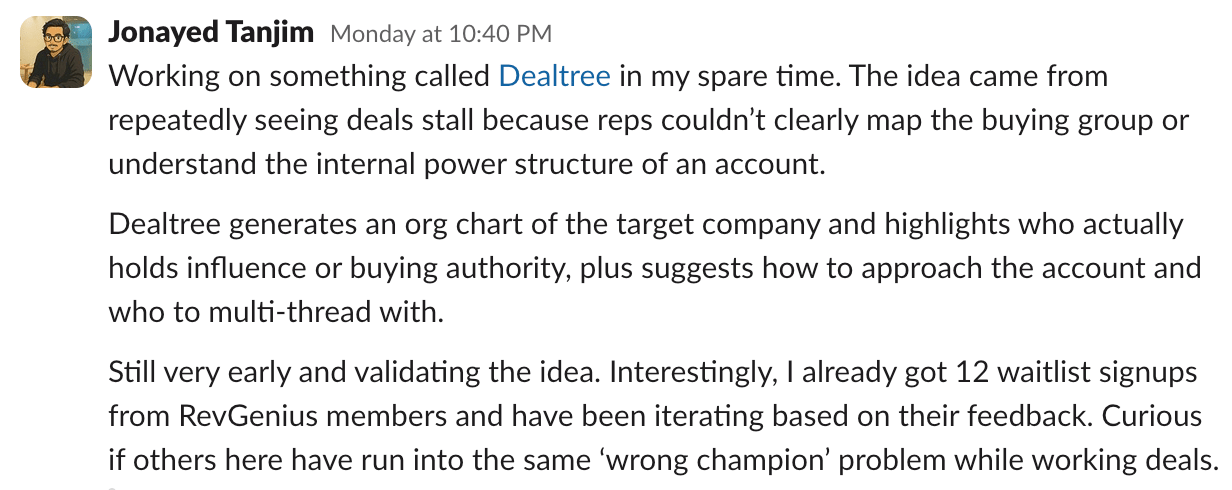 Still early. Still validating. Already has 12 waitlist signups from RevGenius members iterating on the feedback.