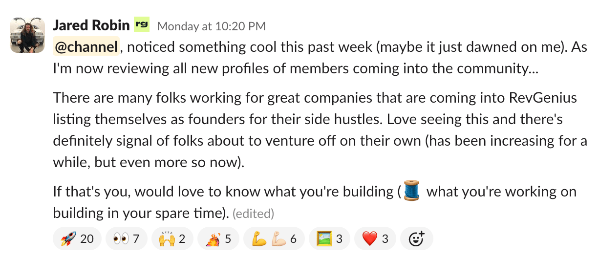 Something caught my attention while reviewing new member profiles. A lot of people joining RevGenius, folks with solid day jobs at great companies are listing themselves as founders for something they're building on the side.
