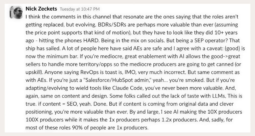 AI doesn't replace roles, it separates people within them. His framework: AI makes 10X producers 100X. It makes 1X producers 1.2X. The uncomfortable part: most people are 1X producers.