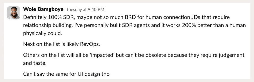 Wole Bamgboye isn't theorizing. He built AI SDR agents and says they work 200% better than a human could. Next on his list: RevOps; the data-heavy, repetitive parts of it. Strategic architecture stays human.