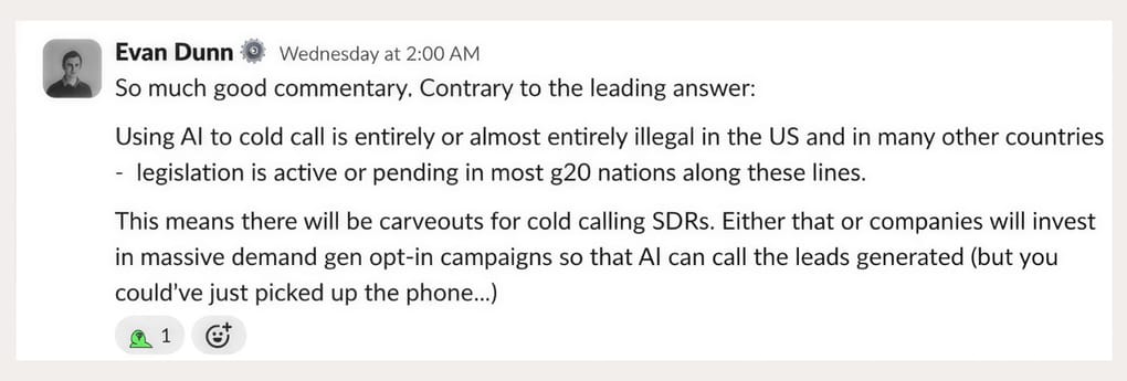 Using AI to cold call is already illegal or near-illegal in the US and most G20 nations. That creates a natural carveout for human SDRs on the phone, not because AI can't do it, but because it legally can't.