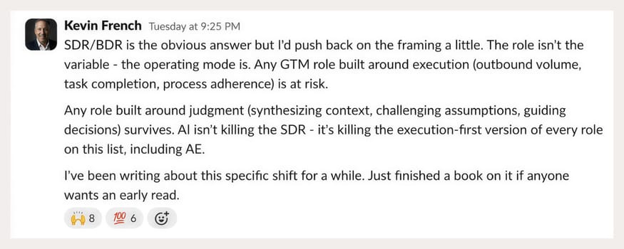 SDR/BDR ran away with it. Content Marketing wasn't far behind. And then Kevin French walked in and changed the framing entirely.